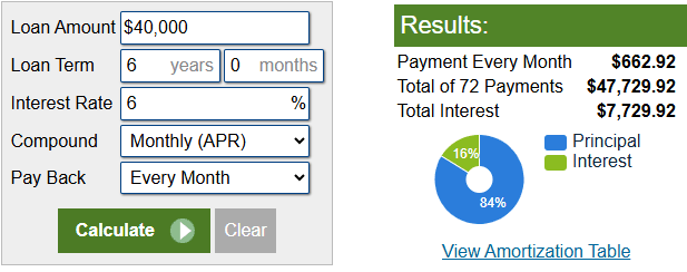 As a quick example, a $40k loan at 6% interest for 6 years would cost over $7,000.
